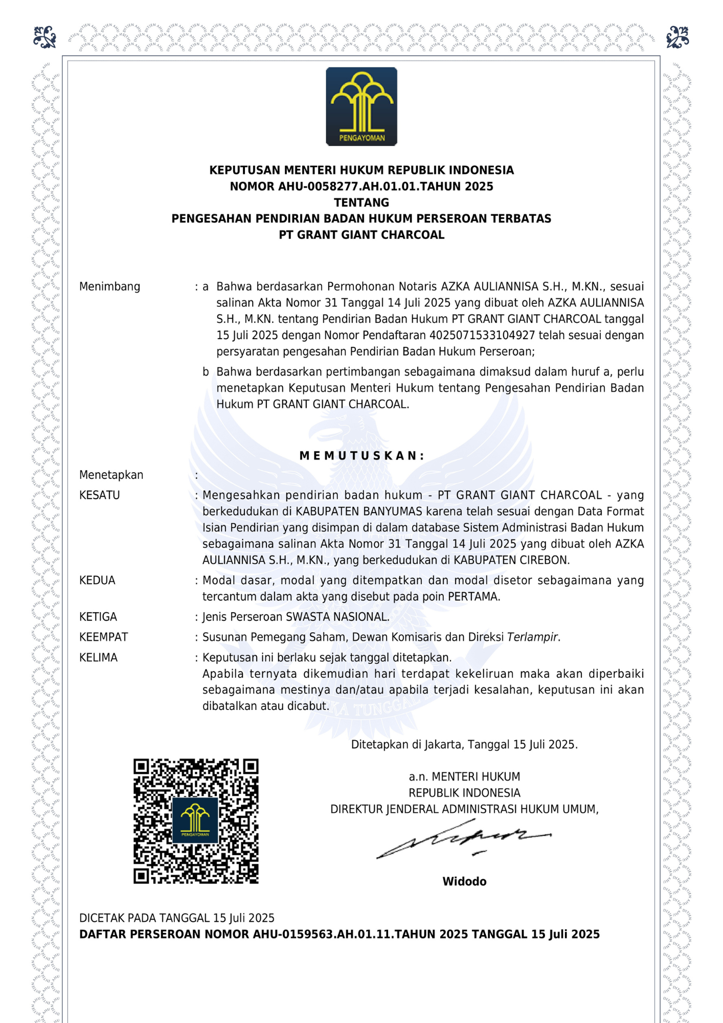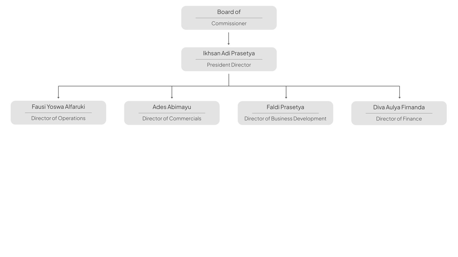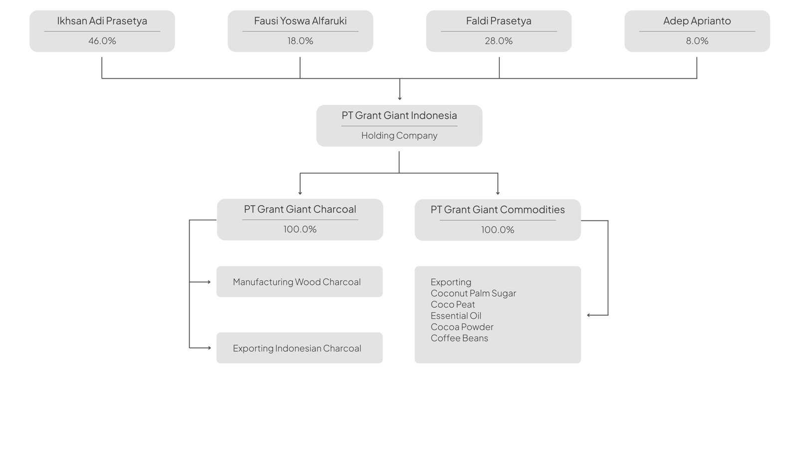 PT Grant Giant Charcoal is led by a multidisciplinary leadership team, with Ikhsan Adi Prasetya as President Director, supported by Fausi Yoswa Alfaruki as Director of Operationals, Ades Abimayu as Director of Commercial, Faldi Prasetya as Director of Development, and Diva Aulya Firnanda as Director of Finance.