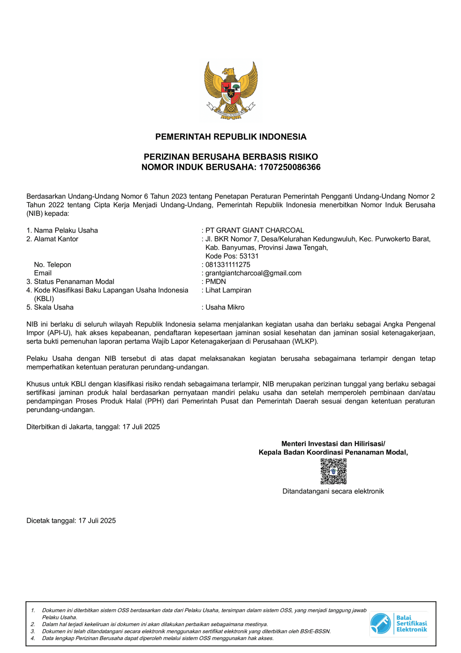 We are PT Grant Giant Charcoal (GGC). We are Southeast Asia’s growing charcoal manufacturing sector, operating with a  focus on quality consistency and supply discipline. Based in Purwokerto, Indonesia, the company is structured to support  global markets, from Southeast Asia as an important competitive landscape within its operational scope.